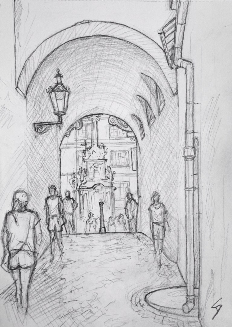 Sheltering from the 37 degree heat in a beautiful passageway. davidasutton.com @davidasutton #drawing #sketch #czech #prague #europe