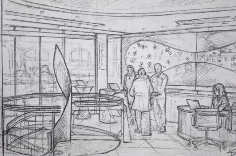 The hotel lobby. It has some great design-led architecture. davidasutton.com @davidasutton #drawing #sketch #czech #prague #europe #breakfast #hotel #hotels #hoteljosef