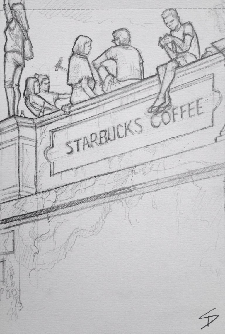 Cafe with great views of the city. It’s a beacon for selfies, risking a long drop for a Facebook post. sketchbookexplorer.com @davidasutton @sketchbookexplorer Facebook.com/davidanthonysutton #drawing #sketch #Prague #travel #travelblog #cafe #starbucks